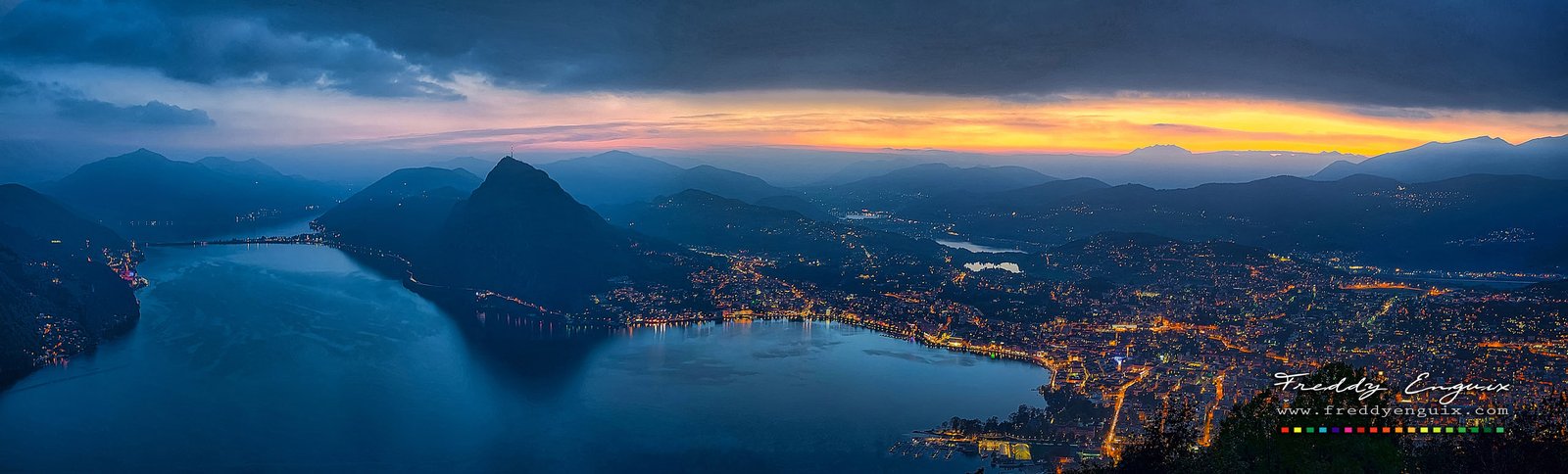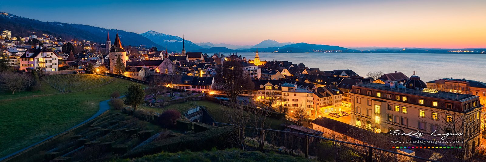 The sun goes down over the lovely town of Zug, in the border of the Swiss Alps. Amazing buildings on the old village! You can also see the "border" of the old town and the towers that protected the houses and all the cathedrals from the enemies!